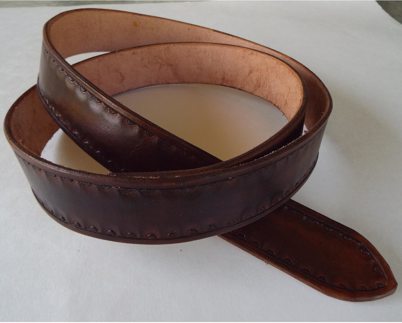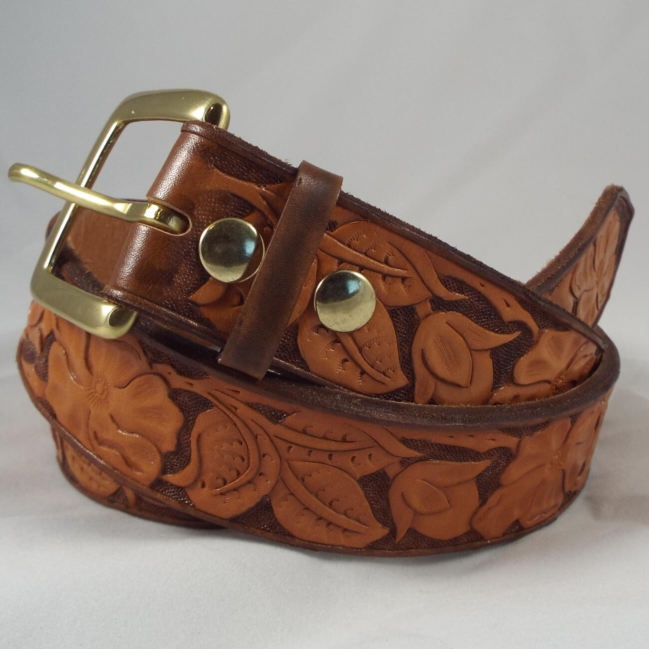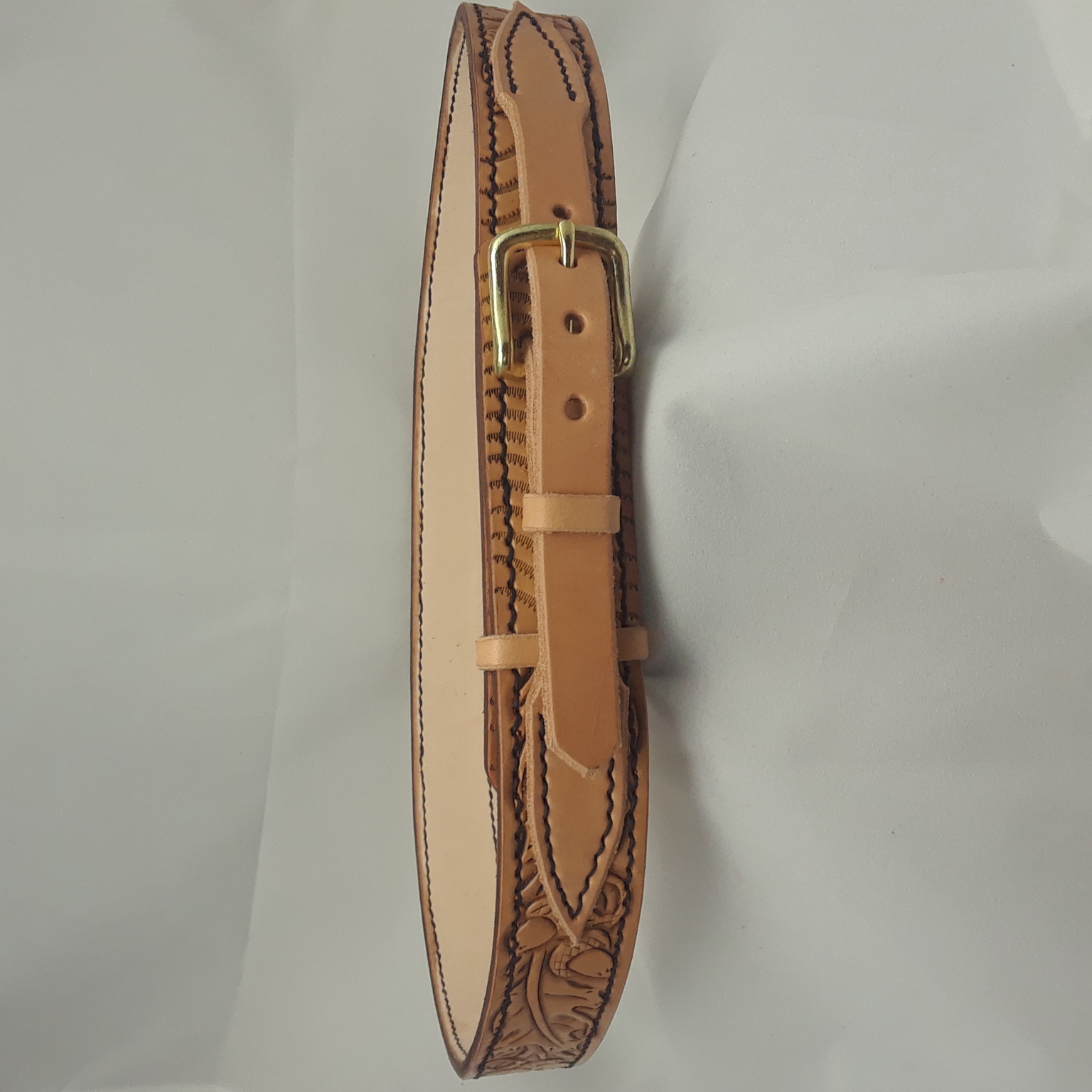 1.5 inch wide belt. Desert Rose tooled pattern with dark brown background.