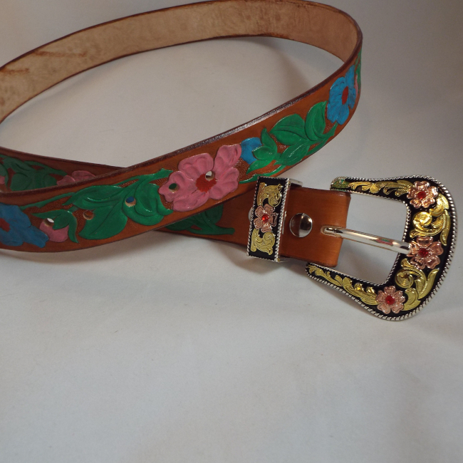 1.5 inch wide belt. Painted Desert Rose tooled pattern.